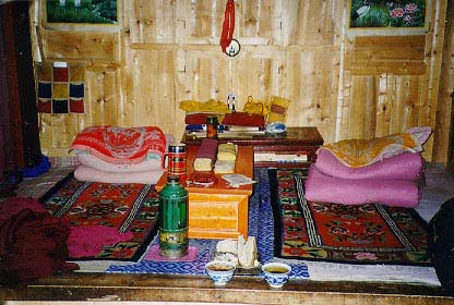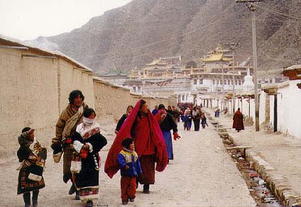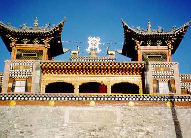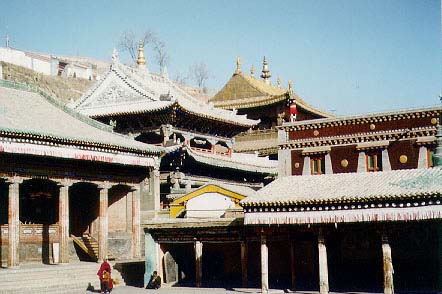 Xiàhé to Zhangye: Buddhist Monasteries and TibetansWell, my first stop from Lanzhou was at Xiàhé, town of the Labrang Lamasery, a few hours south. Very fortunately I arrived at the end of an annual festival, so the town was crammed with Tibetan pilgrims. It being winter, I was almost the only tourist. I spent four and a half hours during the afternoon with them, wandering all the way round the monastery, spinning prayer wheels, murmuring my own, and being entertained by a cocky little boy who came and went. I stood at the back of the beautifully decorated player hall (coloured silks covering pillars, finely detailed paintings on the walls) with hundreds of Tibetans, while monks sat in columns leading up to the front. That evening was an 'exposition' - of several brightly and delicately painted images ('lanterns') made from yak butter. That's right, yak butter. I went up to see this with a couple of the maids from my hotel, so could not spend long there as they were on shift, but it was a marvellous sight - monks chanting on all the rooftops round the large courtyard in front of the main prayer hall, and people patiently lining up to pay their respects. I know very little about Buddhism, but it was a moving scene all the same. The next morning I went to buy my ticket to Jianzha, where I had been told I could change for Xining (to be my next stop - not far from Gumbum, the other significant lamasery outside of Tibet), but the tickets were sold out - stupid girl, should have bought it the day before! Wait two days, I was advised. But I stood around a bit, and the women in the ticket office took pity on me - I was squeezed onto the bus at I don't know whose expense, into the jump seat next to the driver (magnificent views through the windscreen of countryside that changed from grassland, to red rock ravine, to yellow rocky desert, but I suppose I would have been the first to die in a crash!). Right behind me was a smiling handsome young monk, on his way to see his family in Jianzha. We chatted for a lot of the way (stopped for an hour in one town due to deliberations over an arbitrary fine for overcrowding in the bus.....) as much as possible given my absence of Tibetan, and had lunch together after arriving. Zhaxi Sangbo (his name) invited me to go with him to his former monastery, in the mountains above Jianzha. So I did, as there would be plenty of buses to Xining the following day. We took a motorbike-turned-truck up the mountain, along with 15 other adults and two small boys. It would have comfortably held around six people. Early on I had to relinquish my seat for a standing position - I didn't have the muscle, in the squash, to keep more than an eighth of a buttock on the plank, which was just too uncomfortable! So we swerved and swung our way upwards for about an hour, me clutching onto two local women who didn't mind. After we had got out of the truck, with two other monks that we had met in the town, we walked uphill for a further twenty minutes or so to the top. This monastery is one of four above Jianzha, and is made of mud and wood buildings that blend into the hillside, which is barren but for a crop of pine trees on the opposite face. Zhaxi (this might not be the right way to shorten his name) took me to his friend's hut, as his younger brother, also a monk there, had ironically gone to Labrang for a few days and his hut was locked. We washed, and were served a delicious dinner of noodles and pork cooked by Zhaxi's friend. A couple of other monks came by for chats and tea - all in Tibetan, except for the odd thing explained to me in Mandarin. After the friends had left, Zhaxi's friend picked up my camera, so I showed them my Psion. What they liked most about it was the ability to see the timezones of different countries! I went to sleep on one side of Zhaxi's friend's low orange table in the wooden raised section of the hut, and they on the other. The next morning Zhaxi took me round the prayer halls of his former monastery, encouraging me to take lots of photographs. They are also very fine, brightly coloured, the walls covered with religious paintings. After destruction in (I think) 1958, restoration was begun in the 1980s and is not yet finished. Zhaxi and I were fed a breakfast of lamb dumplings before setting off back down the mountain, being picked up by the man with the truck along the way. The journey back to town was far less squashed - and a lot colder and more windy! Luckily we had left bags with Zhaxi's brother in law, the caretaker for some apartments in Jianzha, so we were able to unchill our fingers on a large chimney carrying heat to the buildings from a large coal fire below. From Xining the next day I visited Gumbum - there being no festival, and it being a somewhat more popular Chinese tourist spot, it could not hold the appeal of Xiàhé, but it was worth it all the same. Gumbum is famous for its butter sculptures, which in one hall have become a 'permanent' exhibition. When I arrived at around 9.30 am, the others there were pilgrims, but by the time I left at noon the visitors were mostly Han Chinese tourists, asking for help from tolerant monks on how to bow and how to spin prayer wheels. On the bus back to Xining I was befriended by a lovely Tibetan nomad family, who had come north from their home for a few days to shop and to visit the monastery. Their father spoke good Mandarin (better than Zhaxi), having taught himself when five years old, and he was able to translate things that Zhaxi had written in Tibetan. Back in Xining they insisted on taking me to the room they had rented, and feeding me: tea, big hunks of boiled beef spread on a tarpaulin sack (cut your own chunk, using Dad's large knife), and a kind of 'cake' called tsampa - made by mixing butter, roasted barley flour, tea, and (for my benefit as a first timer) white sugar. It was like eating a cross between butter icing and dough mix - so tasty! But very filling....... After photographs a